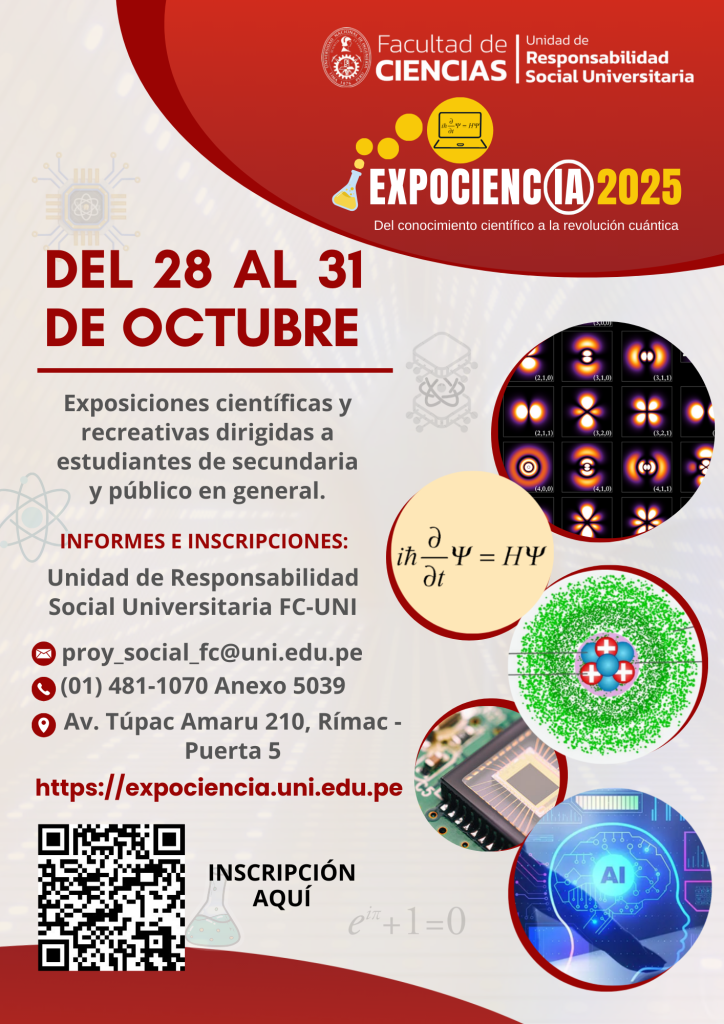 Exposiciones científicas dirigidas a estudiantes de secundaria y público general, el evento se desarrollará del 28 al 31 de octubre del 2025 y contará con la participación de las 05 especialidades de la Facultad de Ciencias, entre ellas: Física, Matemática, Química, Ingeniería Física y Ciencia de la Computación.